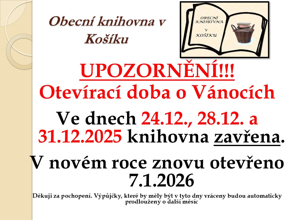 Ve dnech 24.12., 28.12. a 31.12.2025 knihovna zavřena, znovu otevřeno 7.1.2026